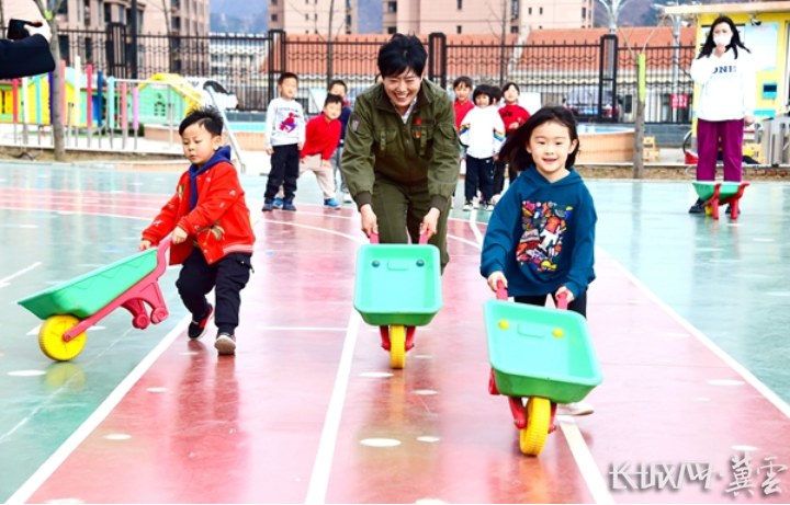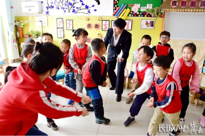 宽城满族自治县第二幼儿园园长金小芳与小朋友们一起做游戏。
